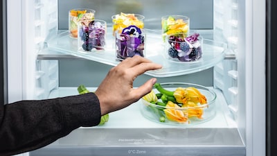 The best place in the fridge to store food? With DynaCool, you can store your food wherever you like. An integrated fan on the back wall ensures cold air circulates evenly, maintaining a uniform temperature and humidity throughout the entire unit. This prevents different temperature zones from developing, allowing you to store various types of food independently of their location.